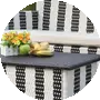 Punch up the patio with this four piece outdoor set cleverly woven into a cheerful awning stripe of grey and white PE rattan. With cushions in sand all weather fabric, this set features a transitional lounge, side chairs and ottoman with vanity panel.