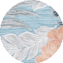 The rug features an alluring pattern, reminiscent of a tranquil garden. Lush botanical motifs of delicate tropical leaves and exotic flowers in blush tones gracefully dance across a cool blue background, creating a refreshing and inviting atmosphere._x000D_